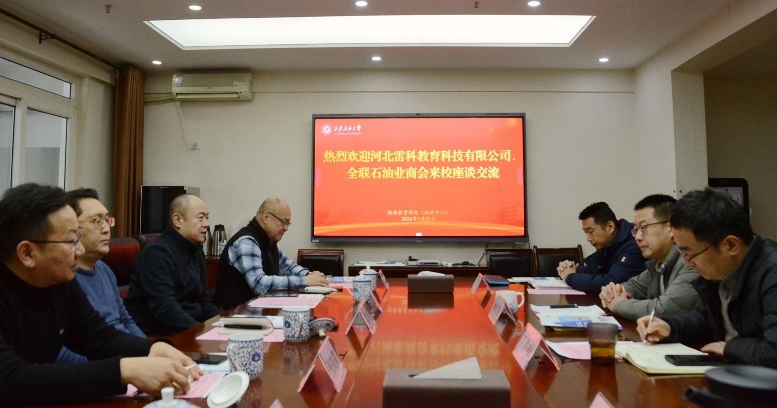 1月21日上午,河北雷科教育科技有限公司(以下简称“雷科教育”)总经理温海斌,全联石油业商会常务理事兼天然气分会秘书长孟庆岩、天然气分会副秘书长张晓霖等一行5人莅临我校走访交流,座谈会在明德校区培训中心北楼召开。我校继续教育学院(培训中心)院长(主任)林红先、副院长丁昌峰,以及双方相关部门负责人出席会议,会议由林红先主持。
